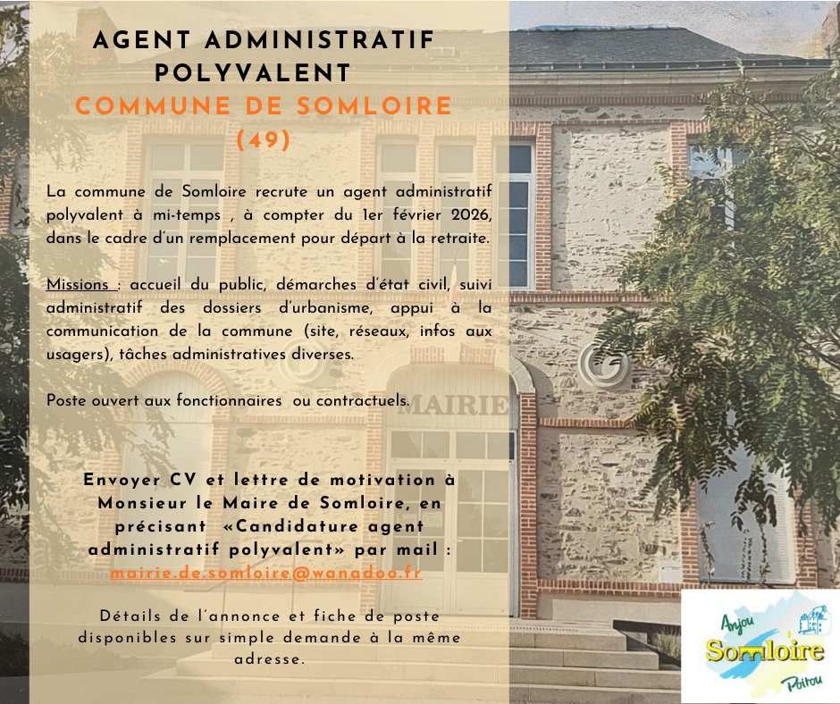 La commune de Somloire (49360) recrute un agent administratif polyvalent (accueil, urbanisme, état civil, communication), à temps non complet (mi-temps), pour un poste à pourvoir à compter du 1er février 2026, dans le cadre d’un remplacement pour départ à la retraite.